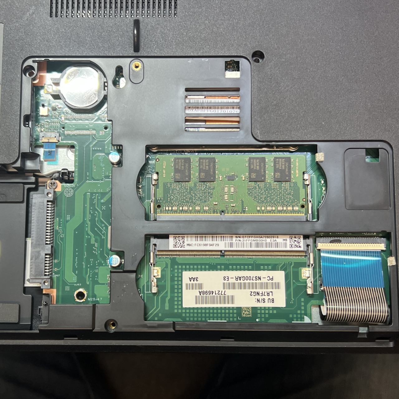 左上の丸いのがCMOSバッテリー。右下の幅広いフレキがキーボードのフレキ。
