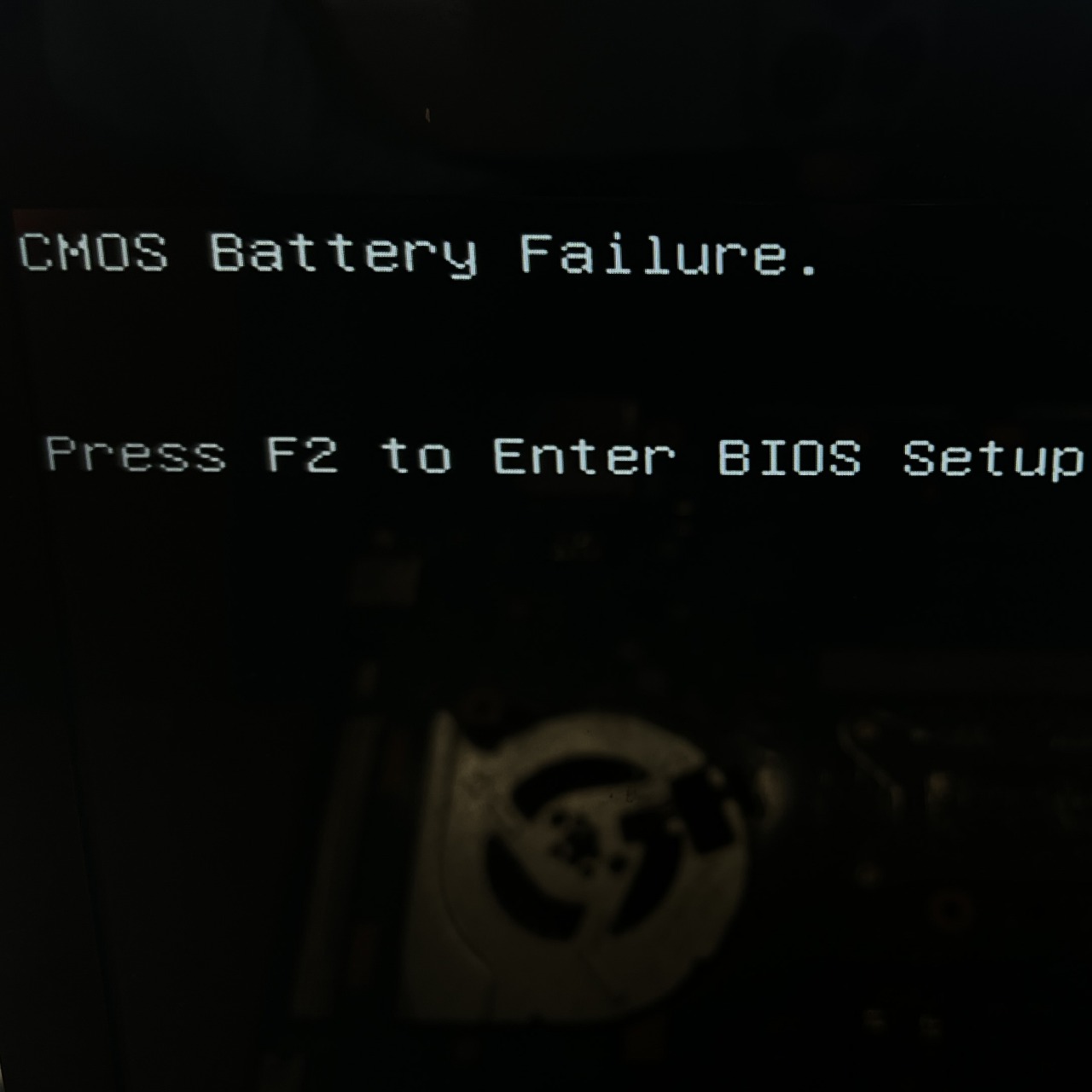 起動確認をしたところ、「CMOS Battery Failure. Press F2 to Enter BIOS Setup」 というエラーが表示されました。(写真をとるためにキートップを外した時に起動しています。)