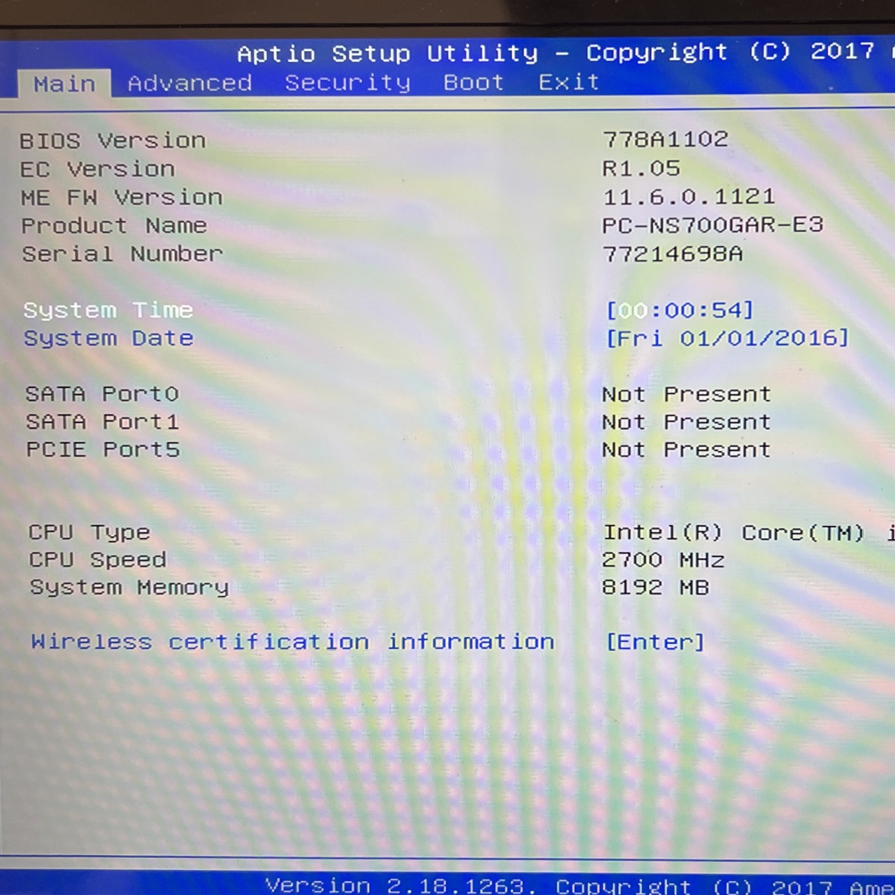BIOS画面を開いて確認すると、System Date が 2016年1月1日 にリセットされていました。これは内蔵CMOSバッテリー(コイン型リチウム電池)の消耗により、BIOSの時刻・設定が保持できなくなっていたためです。