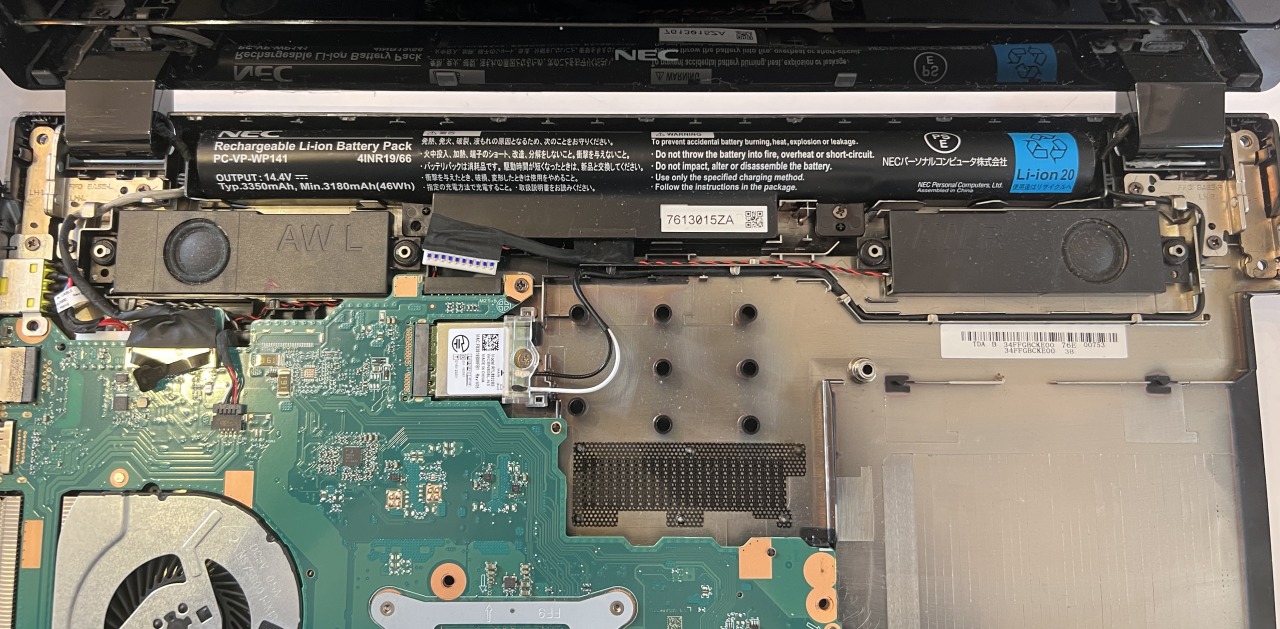 お客様は数日使いたいということでしたので、充電を行い急場動作するようにしてお渡し、内蔵バッテリーの NEC PC-VP-WP141(14.4V / 3350mAh / 46Wh)は、取り替え部品を取り寄せて後日交換という対応になりました。