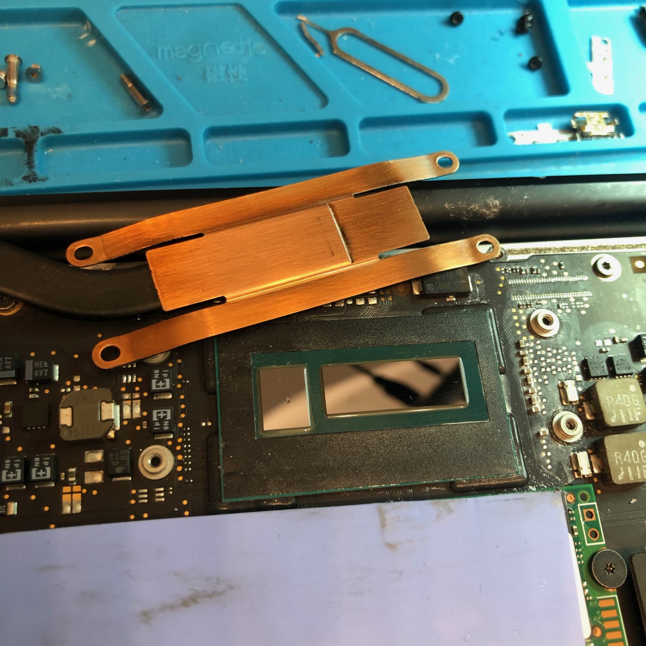 CPU上部もSSDと同様に放熱シートを貼ることにしました。放熱シートがアルミリアケースに接地することでファン以外の放熱手段として期待出来ると思います。